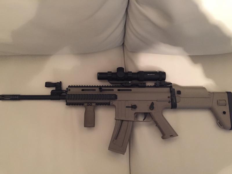 Os presento a mi ISSC MK22 FDE, clon del SCAR L, con las “chuches” que lleva encima, y a falta de que me llegue una Surefire mini scout 300 FDE.