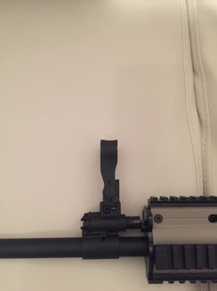Le “puse” una réplica del alza delantera de la marca dboys (airsoft), lo más próxima que pude, ya que lleva otra pieza para encajar el falso gas block de serie, pero da el pego, y es completamente funcional. El alza trasera también es la réplica de la que lleva el SCAR, también de la marca dboys, y funcional en altura y deriva.