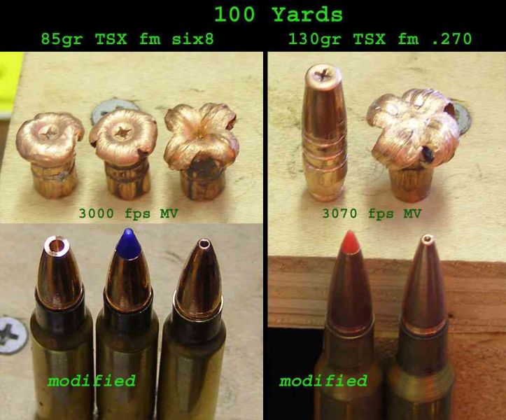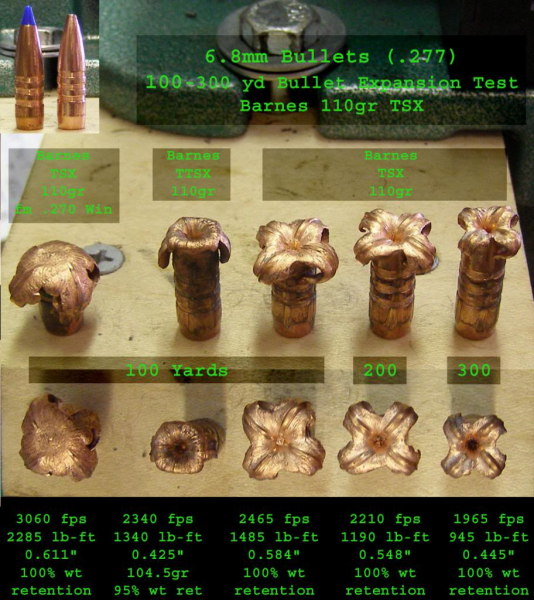 Te paso unas fotografías del forum 6.8 donde puedes ver el comportamiento de la 110 tsx y voy a buscar un grafico del comportamiento de la 130 gr veras como esta disparada en el .270 expande a la perfección y sin embargo no se comporta igual en el 6.8.