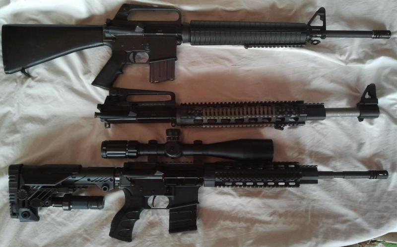 El lote, o parte de él, compuesto por el viejo Colt otra vez tal como estaba en su día excepto el gatillo tipo national match que venía con el Sabre y un carril TDI para poder poner el bípode u otros accesorios y usando ahora el lower de Sabre con culata sniper que en pocos segundos se puede cambiar por la táctica al ir sobre tubo de 6 posiciones y gatillo Timney para diferentes opciones entre ellas las que a la vista están: uper Luvo cal. 300 AAC que aún veremos que tipo de uso vamos a darle, el cañón de Sabre BR paso 1:8 al que se le ha montado un gas-block postizo arriba para poder prolongar la distancia entre miras y usarlo en competiciones de fusil hasta 300 metros.
