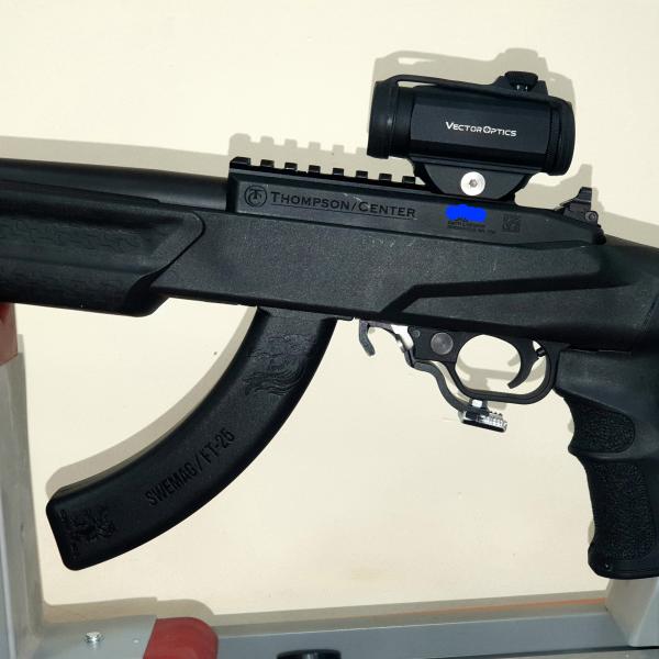 Tiré en un par de competiciones de recorridos de Minirifle en mi club y le monté un Vector Optics 1-4x24, por tener una retícula más sencilla y menos cargada que el Ohhunt y pq, para las distancias que estaba tirando, con un x4 máximo de potencia ya tenía suficiente (de hecho lo llevaba siempre en x2).