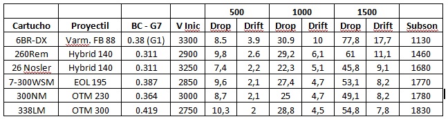 ............ ahora sobre tú consejo al compañero sobre el 338 lapua............ sabes que solo hay sobre unos +/- 25 cm ( eso es un palmo ) de diferencia en caída a 1.000 m entre un 338 lapua y un 260 rem.- 6.5 creedmoor - 6.5×47 lapua ........... menos culatazo, más barata la munición, sesiones de disparo más livianas ............. y si recargas ya no te digo................ merece la pena el 338 lapua respecto a otros............yo para mi NO............... ten en cuenta que en los USA donde los gusta las competiciones de 1.000 yardas y los calibres que prevalecen son los 6mm y 6.5mm, muy raramente ya los 277-280-284.