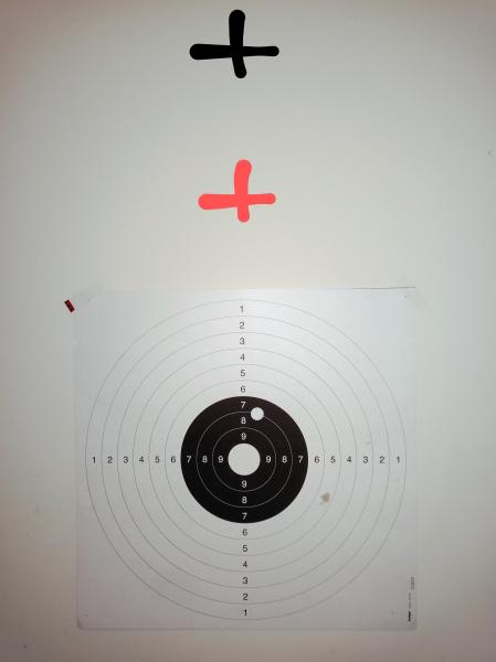 He puesto cuidadosamente el visor en las monturas, nivelando rifle y óptica. Pues bien, al ir a poner el rifle a tiro en la galería, hago aquello de sacar el cierre, mirar por el cañón y centrar la diana (no daba yo un duro por esto) y al llevar la cruz al centro de la diana, en deriva bien, en altura.....la torreta hace tope a casi 70cms por encima del centro de la diana, no se puede corregir más abajo.....He probado a hacer un disparo en esa posición y los tiros se van al 8, un poco arriba a la derecha (ahí es donde me convencí que si mucha gente hace aquello de mirar por el cañón, tan mala idea no era)