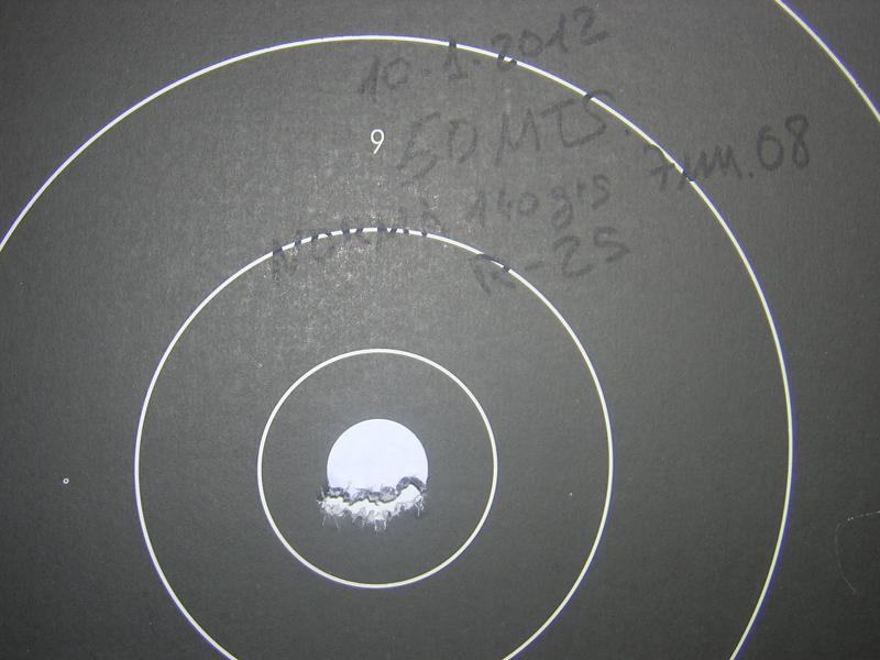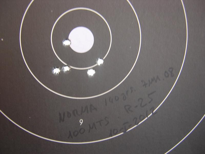 Esta mision es top secret. No hay fotos del lugar. Empezamos a 50 metros, con cartuchos norma, sentados y sobre mesa con la sola ayuda del bipode. 5 disparos las dianas son de pistola 25m. de duelo y con un parche en el centro como referencia. Resultado 16 mm. entre los centros mas distantes.OK.