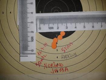 Saludos para todos , os dejo unas fotos de dianas de mis primeros tiros con la Norinco JW15A, son a 50 mts. Esta recien sacada de la caja ,limpia de exceso de aceite y sin ningun afinamiento .Con apoyo delantero en la bolsa de tiro y culata al hombro ,mira telescópica 3-9X50 económica. No son muy relevantes pero creo que esta carabina es mejor de lo que la pintan.El cerrojo va durillo y el cargador igual. Alguna agrupación me ha sorprendido. Las dianas pequeñas son de pistola neumática.
