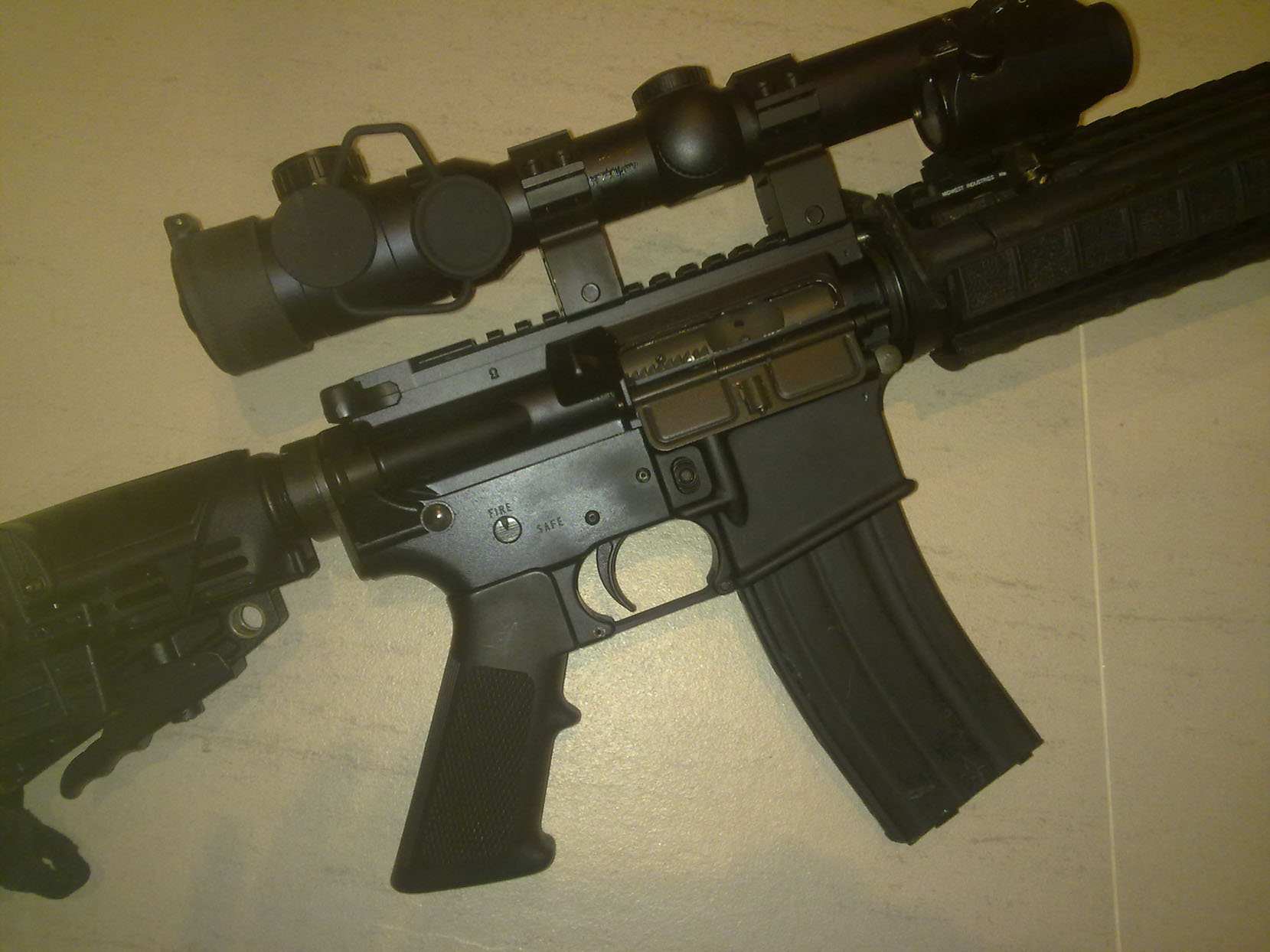Bumba es un Sabre Defense M5. Lleva lo justo, ya que tiene un cañón pesado de 16" y si te pones a meterle cosas acabas sin brazo de apoyo. Lleva railes Samson, miras YHM, un Harris, un Grip genérico, y una mira aimpoint Comp3ML. El pistolete es un CAA ajustable y la culata es una Magpul UBR y todo lo demás viene de serie, ya que para mi los Sabre salen perfectos de la caja, exceptuando la culata.
