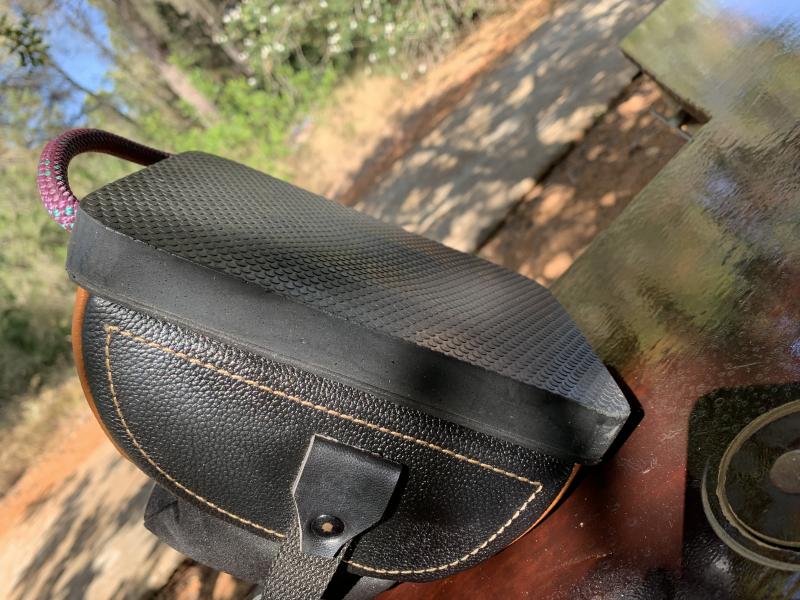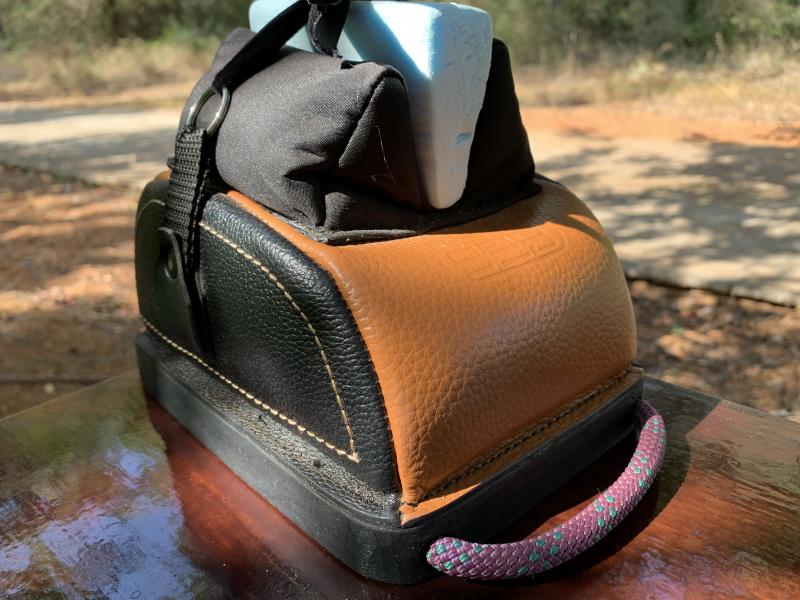 Peana de madera con goma debajo. Es importante que el saquete descanse en plano. Hay modelos con "barriga" que hay que estabilizar. Ahora pondré fotos.