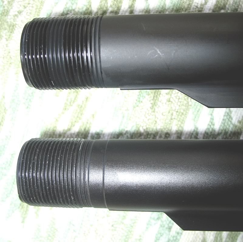 Lo que si que cambia es la forma de las roscas del Mil-Spec, que siendo el mismo paso, tiene roscas mucho más puntiagudas para que tengan más contacto con el Lower y se agarre mejor.