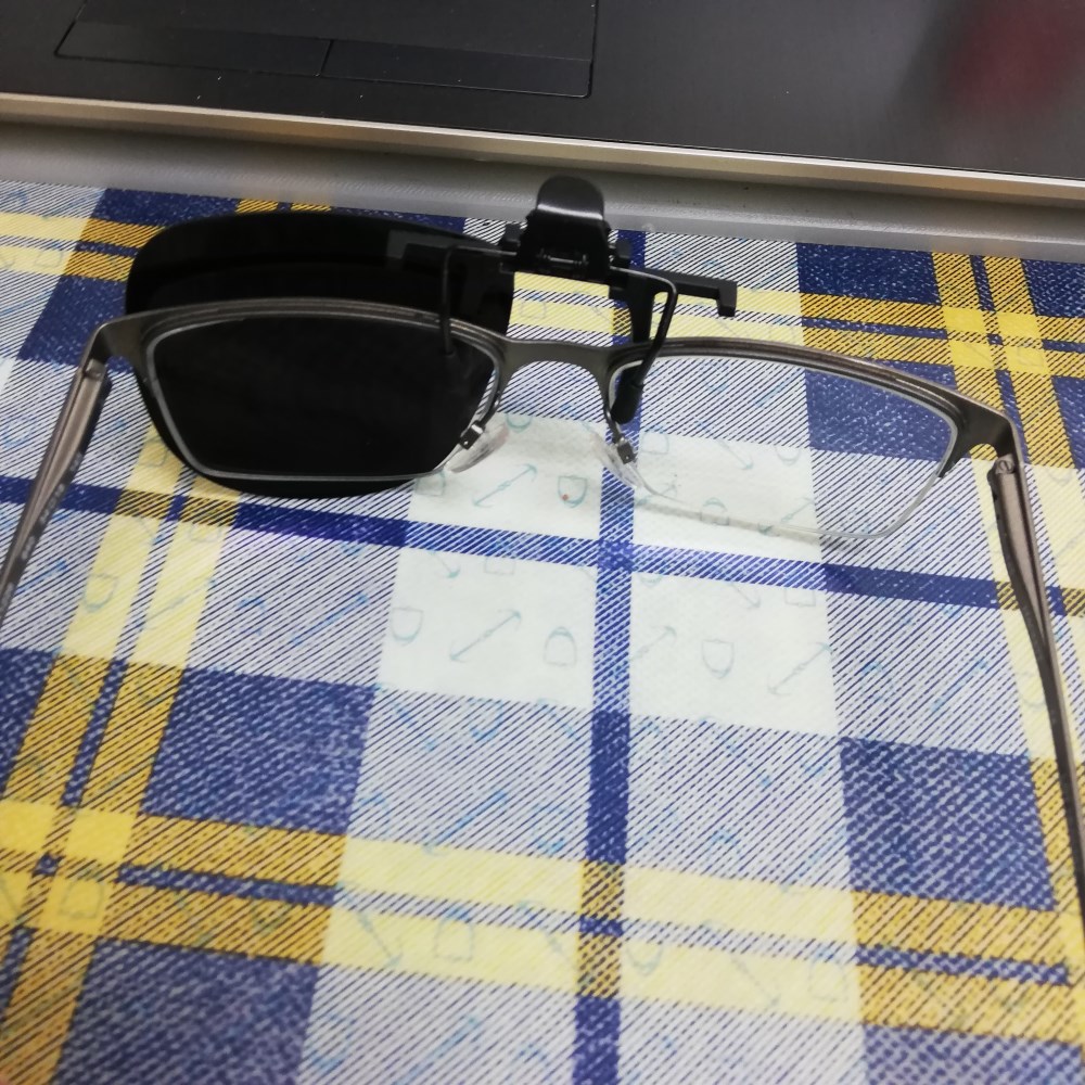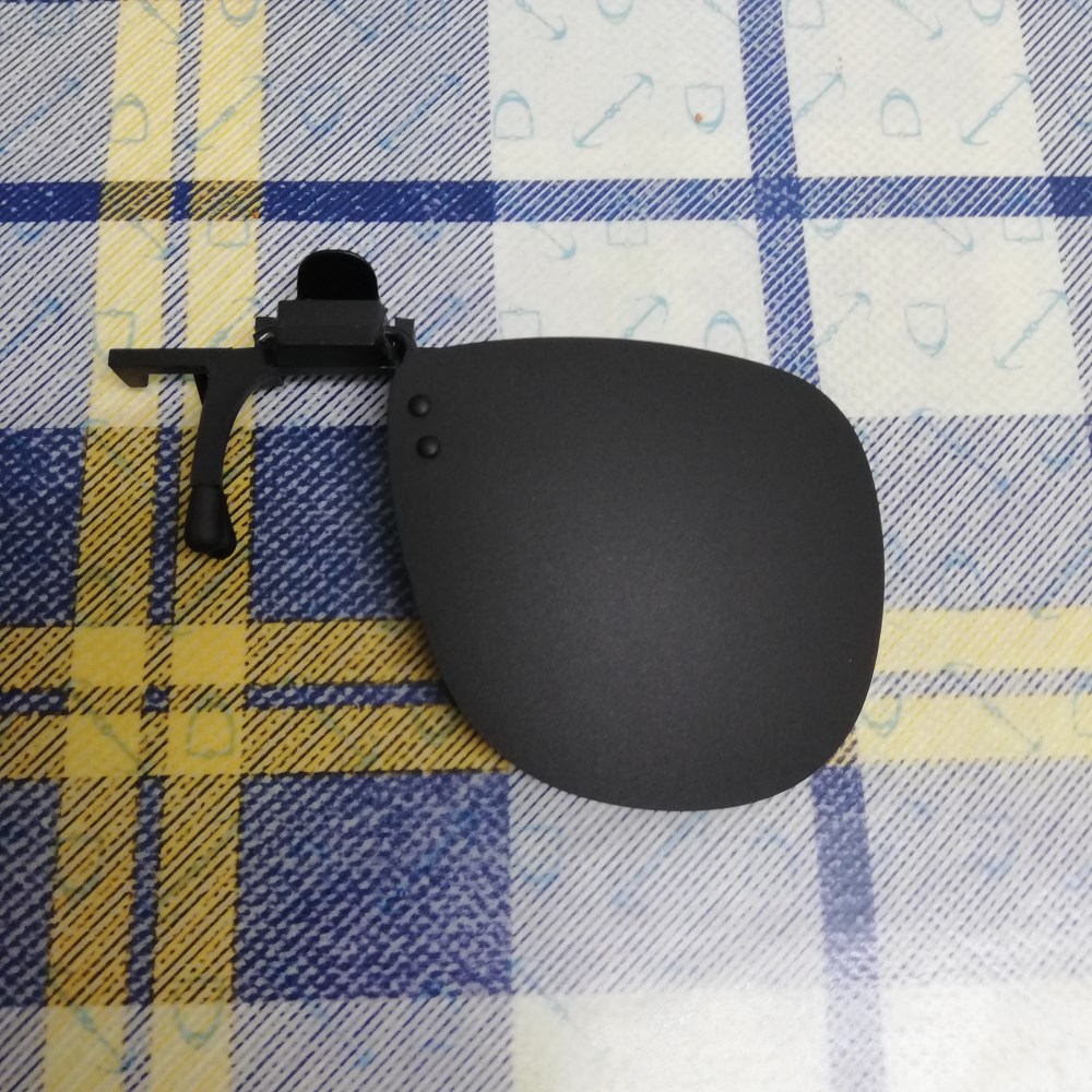 Es un suplemento de esos que se ponen para el sol encima de las gafas de ver, al cual le quite el cristal y la patilla izquierdos y lo pinte con spray negro mate.