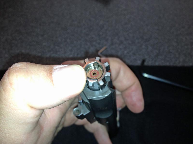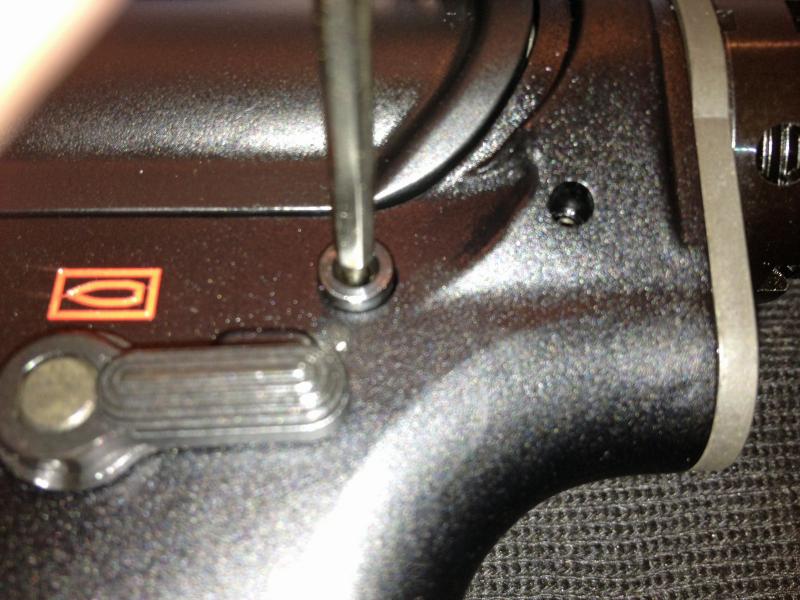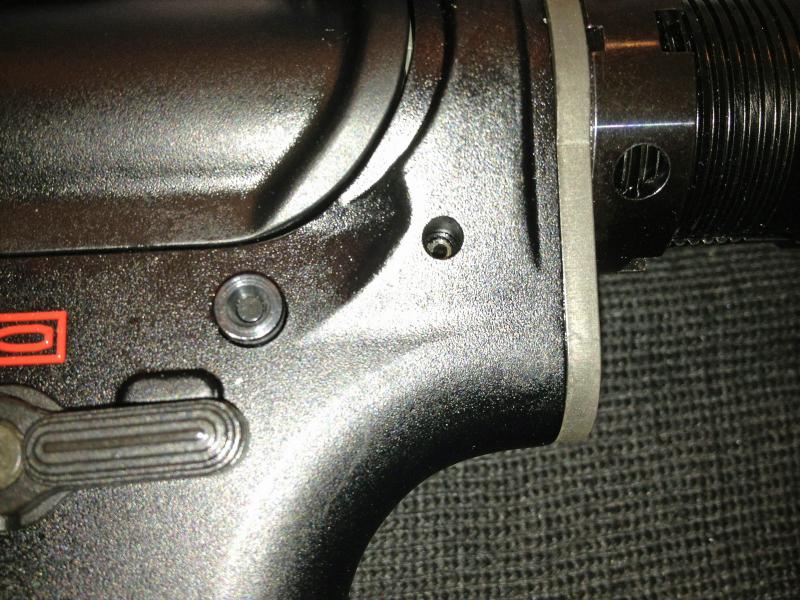 Presionando el interior del pasador con la herramienta conseguimos desbloquearlo y extraerlo. Esto no ocurre en la versión militar, el HK416, que tiene pasadores estandar como el resto de los AR15