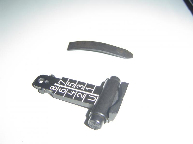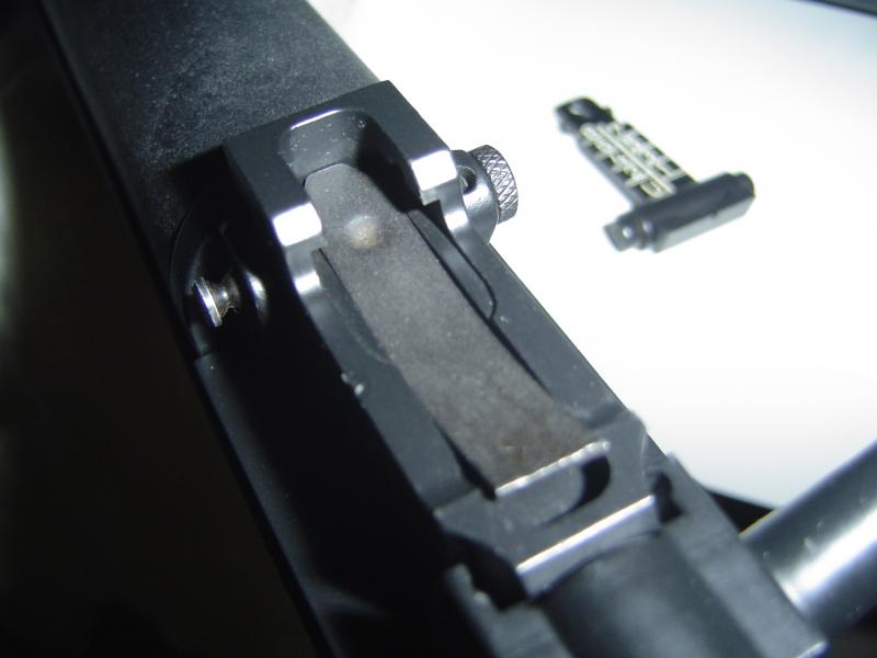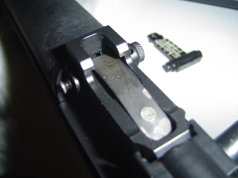 Primero monta la corredera en el alza y luego coloca la pletina. Esta debe quedar fijada en la base de la mira y su parte delantera tiene que apretar la parte delantera del alza para empujarla hacia arriba. Esto es importate, solo tiene que hacer contacto delante de los enganches del alza. De esa forma al empujar hacia arriba la parte delantera del alza, la parte que está detrás de los tetones o enganches, es forzada hacia abajo.