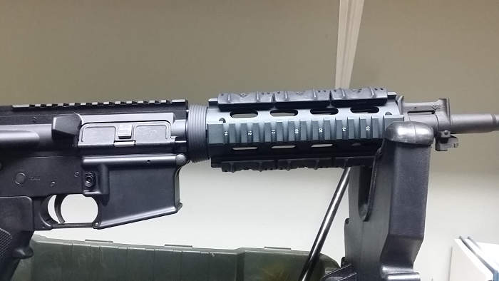 Por ejemplo asi , pero sigo estudiando como hacerlo regulable sin llaves y que me entre en un guardamanos flotante, evidentemente con ese tipo de guardamanos no necesitaria los railes :birra^: