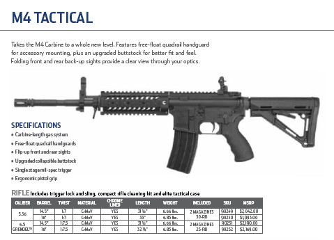 El M4 en cal.223 rem y como esta prohibido en España,como que no.Un 222 rem en un cañon de 14 pulgadas se queda en un rango practico de 150 mtrs.Para tunearlo,si,pero como efectivo el M5.El cañon del Sabre de 16,75 pulgadas tiene un rango efectivo de 200 mtrs.El cañon de 20 pulgadas de un Oberland me parece demasiado para un rifle tactico,ademas viene con culata de una pieza.Con 20 pulgadas y municion comercial te vas a 250 mtrs.El Oberland o cualquier AR15 de 20 pulgadas me parece mucho trasto.Desde mi humilde punto de vista,el cañon ideal es el de 16,75 pulgadas y mas en 222 rem,insisto en que en un M4 perdemos 50 mtrs de efectividad.El M4 es mas bonito,mas corto y 100 grs mas ligero,pero menos efectivo.