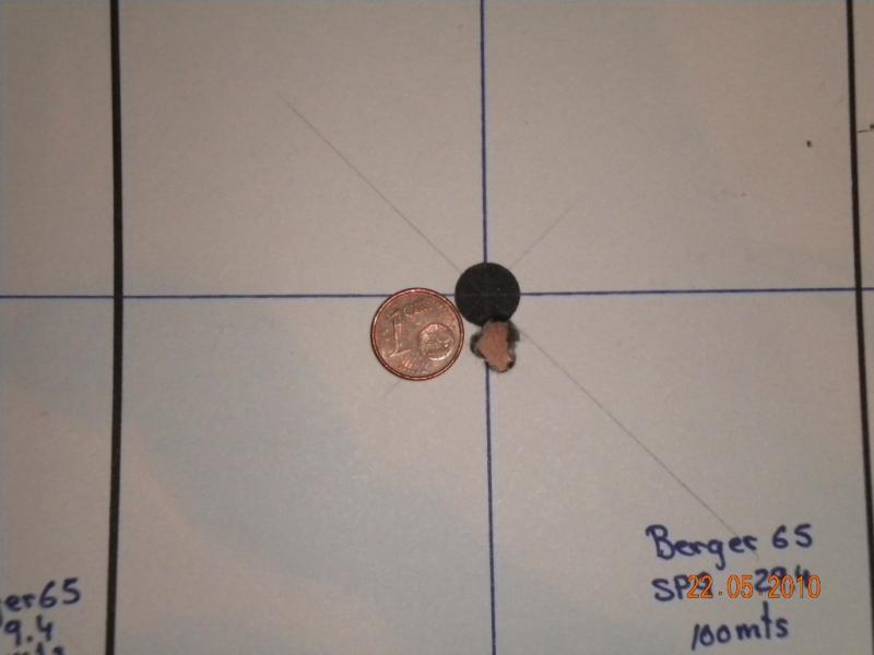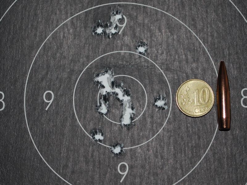 Vainas Norma recargadas con punta Scenar moly 105 gr, 30 gr SP11, pistón CCI small rifle (400) Blanco de 300 m reducido a 100, el diez tiene 33 mm de diámetro