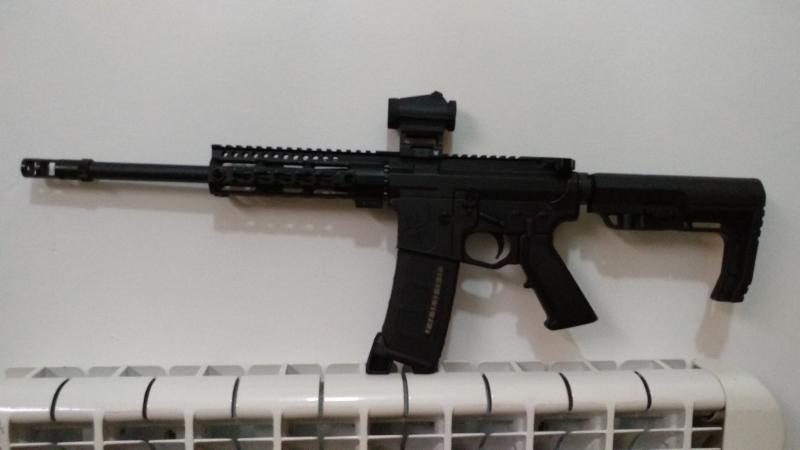 La base es un S&W 300 BLK, le he cambiado el guardamanos, le he puesto la empuñadura vertical, bípode Harris, soporte para la linterna (no la he puesto para la foto).