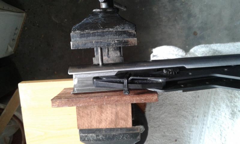 Otra solución mas fácil a la prensa, es usar un tornillo de banco de calidad, y empujar apretando las mordazas con una pieza de acero de ligeramente menor diámetro que el pasador, evidentemente, usar unas maderas para no marcar todo el cerrojo, sin olvidarse de hacer un taladro en ella para que vaya saliendo por ahí el pasador.....