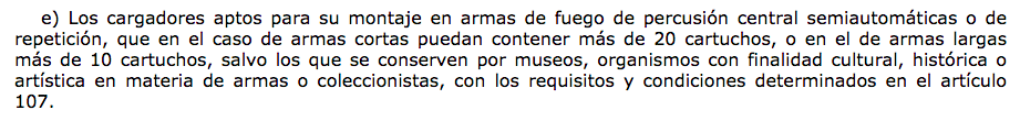 Si vemos la redacción anterior del Reglamento de Armas (vigente hasta el 4 de noviembre de 2020), prohibía la tenencia de armas largas semiautomáticas de fuego central que tuvieran una "capacidad de carga superior a 5 cartuchos" (incluido el de la recámara), y se entendía que un cargador de 30 cartuchos limitado a 4, cumplía el requisito, pues ya no tenía capacidad para 30 cartuchos.