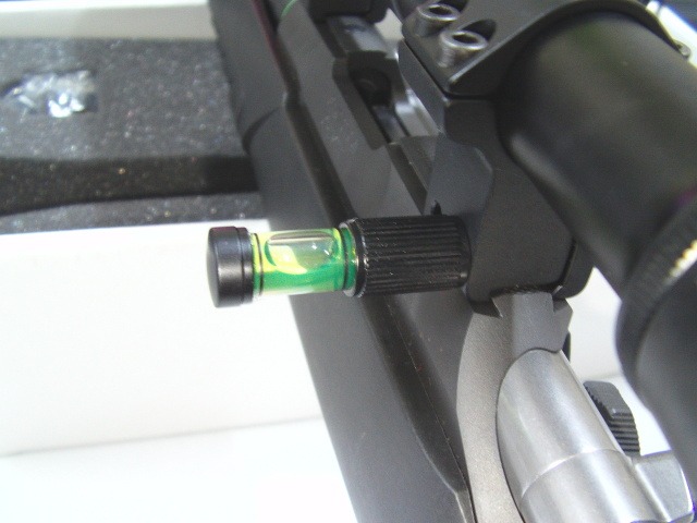 El nivel viene en otro blistec junto con otro tornillo igual a los que llevan las anillas y que sujetan al carril pero más corto. Su misión es sustituirlo por uno de las anillas para que cuando enrosquemos el nivel por el lado opuesto no se toquen los tornillos. Este sistema de colocar el nivel es realmente bueno ya que sin necesidad de mover la cabeza ni los ojos se puede comprobar su posición mientras apuntas. El castigador ya puso fotos en este mismo hilo sobre el mismo nivel, pero os pongo las que he sacado yo.