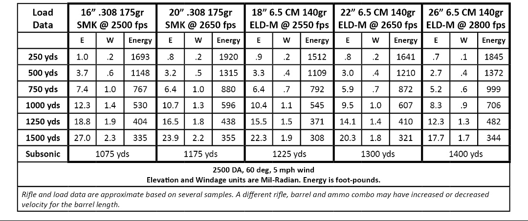 En comparación con un .308 de 16" el 6.5 en un cañón corto tiene 10%-20% menos caída y se ve afectado un 20%-40% menos por el viento. Un .308 de 20" iguala o puede tener más caída que un 6.5 Creedmoor, pero el 6.5 es un 15-30% más eficiente con el viento.
