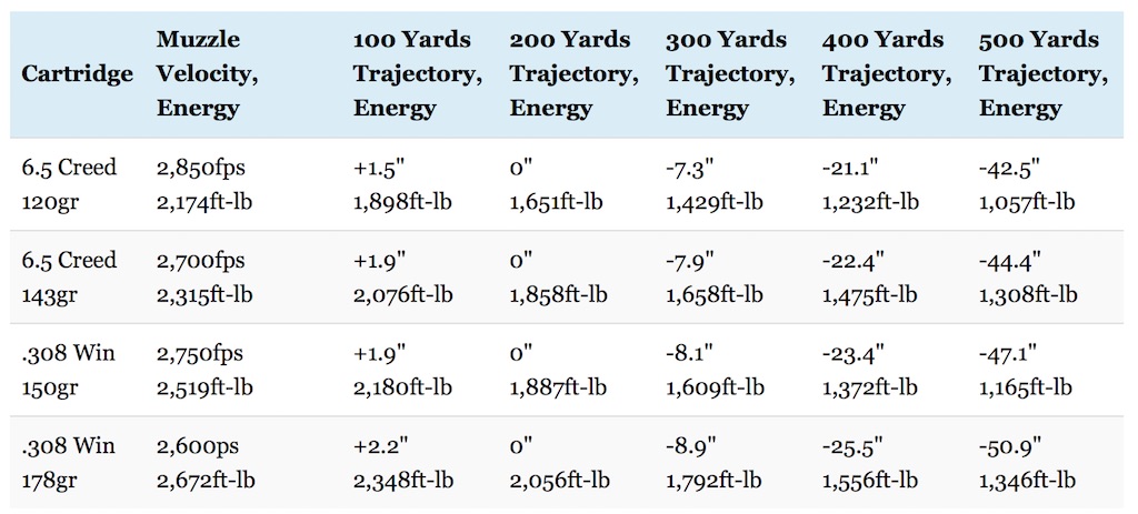 En comparación con un .308 de 16" el 6.5 en un cañón corto tiene 10%-20% menos caída y se ve afectado un 20%-40% menos por el viento. Un .308 de 20" iguala o puede tener más caída que un 6.5 Creedmoor, pero el 6.5 es un 15-30% más eficiente con el viento.