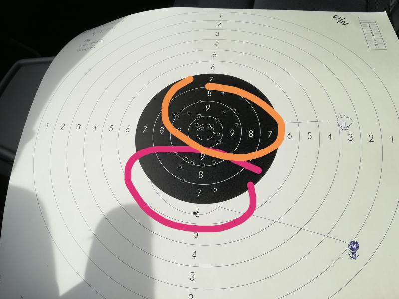Pues por fin he podido estrenar la M1. 3 interrupciones en 100 disparos con CCI standar, no está mal y un rato muy divertido. Primeras dianas a 25 m. La primera senatdo con saco de tiro y miras abiertas con un grupito muy majo una vez corregida la altura. La segunda de pié con miras abiertas, un grupo con el punto de mira por debajo del negro y otro apuntando al centro. Le voy a pintar una raya blanca al punto de mira por que la verdad es que contra el negro no se ve nada.