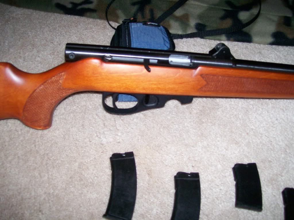 Me acabo de comprar una carabina del .22 LR fuerte, de oferta, nueva, con cuatro cargadores, semiautomática, se desmonta sin herramientas en menos de un minuto, traga balas de alta velocidad sin romperse, miras trasera de librillo regulable a 25.50,75 y 100 metros, es Rusa, el seguro además del gatillo bloquea el cierre, tres muelles recuperador, uno de ellos hace también de muelle de Aguja.