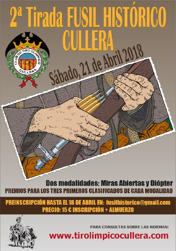 Buenos dias compañeros , ponemos en conocimiento vuestro que el proximo dia 21 de abril en club de tiro Cullera realizaremos una tirada de fusil historico ,os invitamos a participar