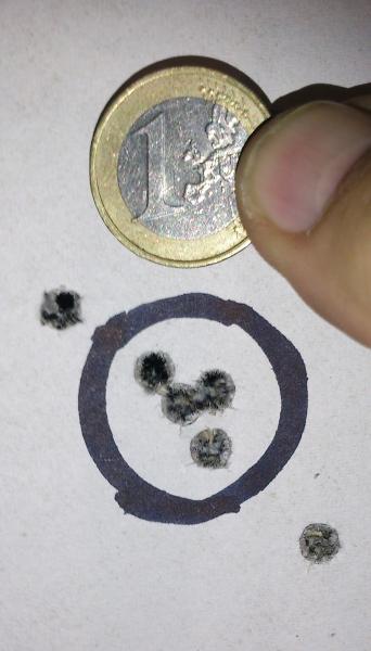 Un blanco a 100 metros con RWS T mantel de 50 Grains, los dos tiros fuera son los del centrado, pero esto se puede superar sin problema, en mi club de tiro se jugaban las cervezas a dar a un céntimo a cien metros y no tenían que tirar muchos tiros para volarlo de la diana....