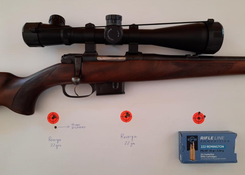 Aún son pruebas a 50 m con .222 recargado con 22 gns y munición comercial, con el CZ.
