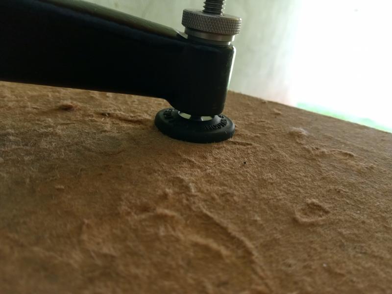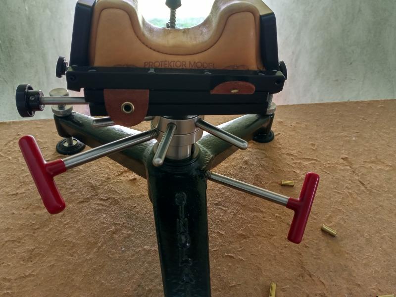 Las mesas de Bench-Rest no son todas iguales aunque lo parezcan. Esta mañana iba a tirar a 50 m con la carabina de Open, he montado los trastos en una donde nunca me pongo y enseguida me han dado ganas de comprobar si el tablero estaba horizontal. Estaba tan inclinada que he tenido que sacar el tornillo de la pata izquierda y meter el de la derecha todo lo que se ve en las fotos. Entonces el arma no estaba canteada.