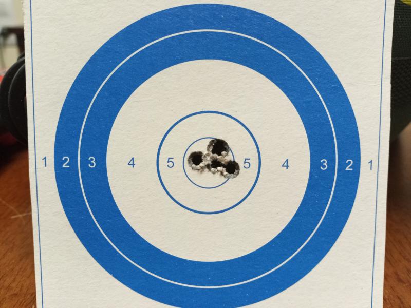 En realidad me interesaba probar esa munición, que creo que con eso ya está en su límite o casi, y ponerla en el centro en altura y deriva, porque estaba tirando con el blanco de 100 m rimfire ya que no tenía a mano el de 50 m, que tiene los circulos más pequeños, claro. Probaba si entraba en el V-Bull de 100 para trasladar la dispersión al de 50 con el compás. Total ...