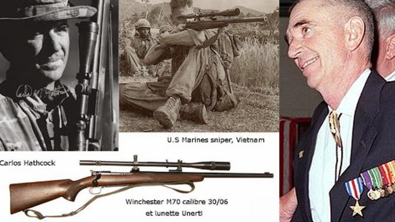 Ese soldado que aparece apuntando el Winchester Van Orden con el negrito de transmisiones detrás no es Carlos Hathcock. Es Gunderson, otro sniper del USMC, que figura con una o ninguna baja. Lo aclaró de modo incontestable Wiley Clapp, hoy periodista de armas, que fue su Capitán en Vietnam, cuando se dio cuenta de que se divulgaba una foto equivocada. Pero el mal ya está hecho: es que además no se parecen en nada. Dijo hasta el nombre del negrito, pero ahora mismo no me acuerdo. Ya lo encontraré.
