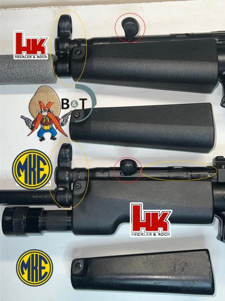 señalado en amarillo, se aprecia la diferencia de acabado entre el MKE equipado con guardamanos de linterna HK (abajo) y el SP5L (arriba), . También destaca la distinta textura de polímeros, siendo el guardamanos inferior, fabricado por MKE, más basto.