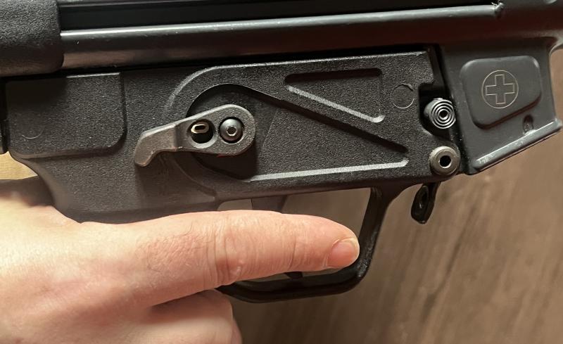 detalle de la versión ambidiestra del selector del B&T96, con ventana