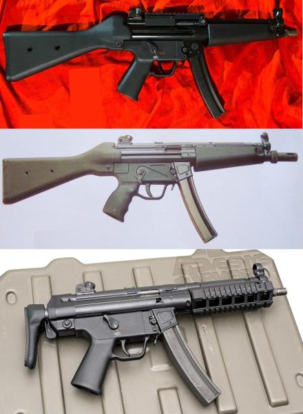Comparativa entre el túnel de punto de mira cerrado (derecha) y abierto (izquierda), mostrando cómo Brügger & Thomet adaptó el MP5 suizo para mejorar la compatibilidad con ópticas Aimpoint montadas en bases Picatinny.