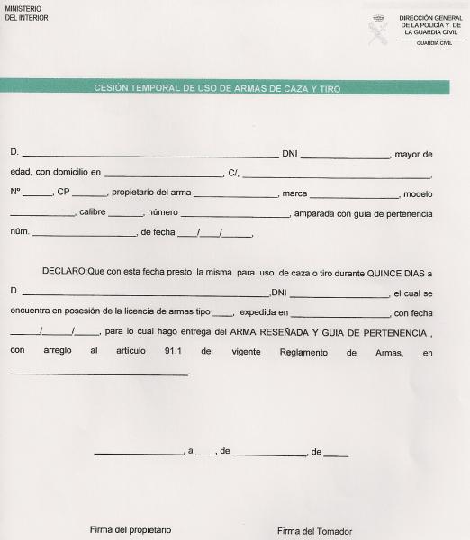 Estos documentos son de la G.C. y si los firman por ambas partes junto con con la Guia del arma las Licencias y los DNI ya tienen todo completo para hacer la transferencia del arma en la I.A. del comprador o del vendedor
