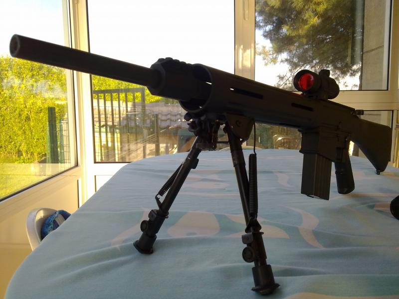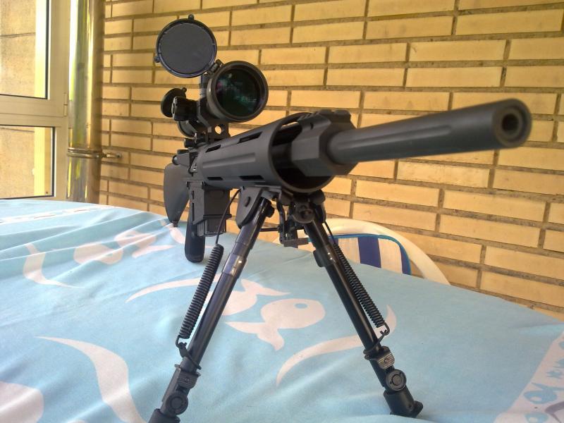 La unica reforma que tiene es que el guardamanos flotante esta recortado 15 mm. con vista ha aligerar su imagen, lo que deja ver ligeramente el tubo de gases. Su peso desnudo son casi 4 kg.Lleva montado un bipode y un visor Bushnell 6500 elite 4,5x32x50 mildot. Con estos accesorios el peso sube a 5,1 kg. con cargador 5,3 kg.