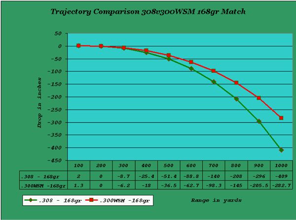He encontrado un vídeo que compara la trayectoria del proyectil a 500 yardas de un 300wm y un 308w. Se puede apreciar una trayectoria más plana del 300wm y un disparo más agresivo, mientras el 308w tiende a hacer mayor parábola.