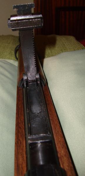 Lo prometido es deuda. Aquí estan las fotos de las anillas y la muesca donde estaba el alza original. Un comentario adicional que tiene que ser corroborado por un especialista: cuando la compré, no me gustó la terminación de la madera y se la llevé a un armero que tambien hace trabajos en culatas y éste me dijo que los chinos copiaron la sana costumbre de los rusos de cromar el interior de los cañones, los que los hace casi eternos y que en las armas Norinco que vió, todas tenian esa característica. Si alguien con mas conocimiento sobre el tema pude aportar algo para dilucidar la cuestión será bienvenido.
