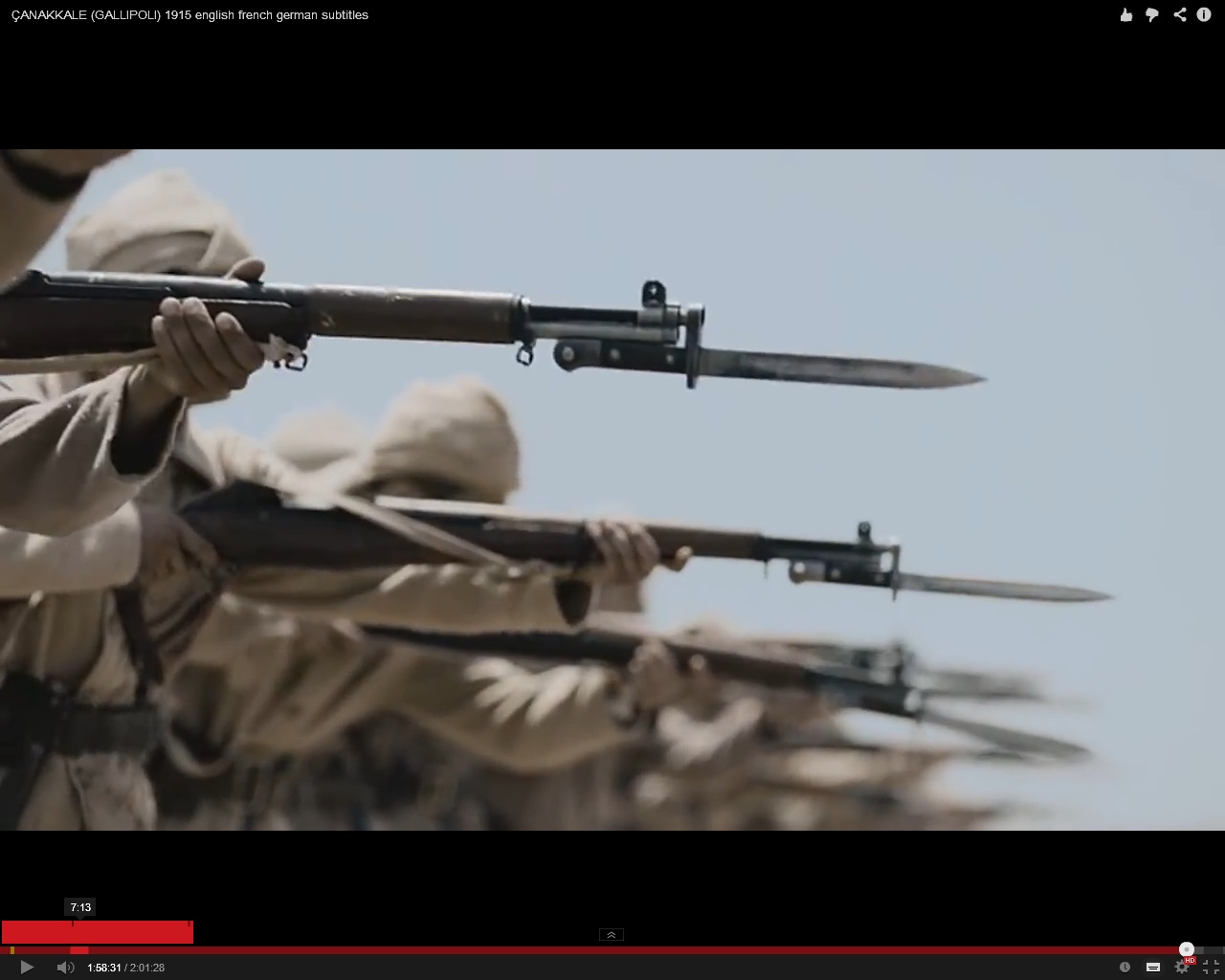 una peli turca de 2012, sobre la campaña de Gallipoli en 1915, desde el punto de vista de los turcos. Algunos payos usan máuser largo (bien) y otros usan M-1 GARAND (fatal). No la he visto entera. Pueden salir otros fallos garrafales, visto lo visto.