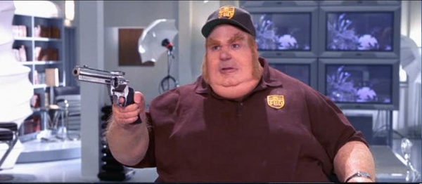 La peli es AUSTIN POWERS, LA ESPIA QUE ME ACHUCHÓ y el arma es un Dan Wesson HV-15. El personaje de la foto se llama GORDO CABRÓN