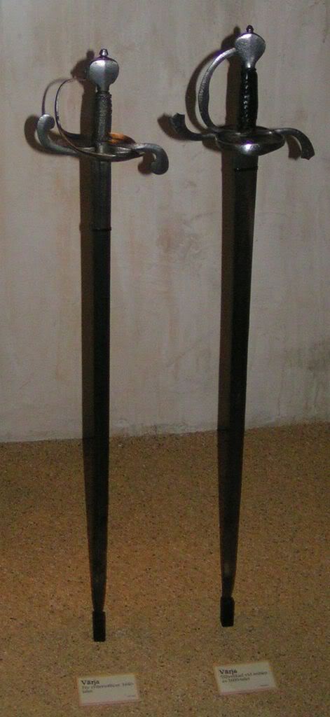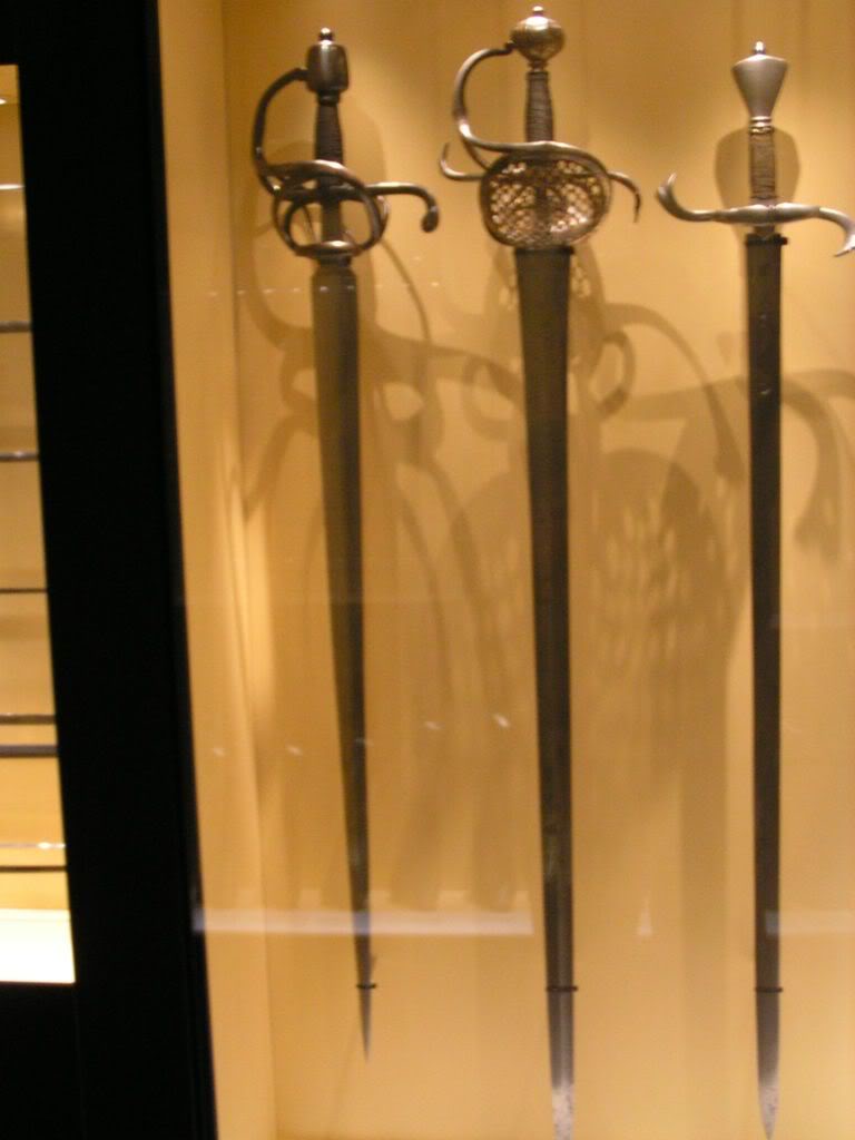 Más fotos, en este caso de espadas militares del siglo XVII. En general se las llama espadas de punta y corte pero también pueden ser llamadas roperas. Hay ejemplos de Inglaterra, Suecia, España, Italia y Alemania. Podéis comprobar que a pesar de las diferencias geográficas que las puede haber... el uso de este tipo de arma estaba extendido por europa. ES decir en un combate entre un español y un inglés estas serian las armas que se batirían no la espada vikinga.