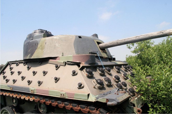 en el campo de entrenamiento de Ohrdruf, se trata del chasis de un Raketenjagdpanzer 4 Jaguar 2 que originalmente estába equipado con 2 lanzadores de misiles HOT. El Jaguar era la versión misilistica del Panzerkanone 1 dotado del mismo cañón de 90 mm del carro M47.