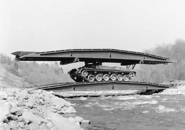 - Carro puente Brü Pz68 AVLB suizo con el sistema deslizante, cruzando un puente ya desplegado por otro carro puente.
