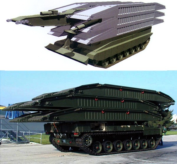 Finalmente pos pongo las imagenes de un carro puente de diseño aleman de la casa MAN basado en un triple puente deslizante sobre chasis de carro Leopard 2, el carro puente Leopard Panzerschnellbrücke 2 con puente modular Leguan PSB2. Los americanos tiene previsto montarlo sobre los chasis del M1, recuperados por destruccion en Irak.
