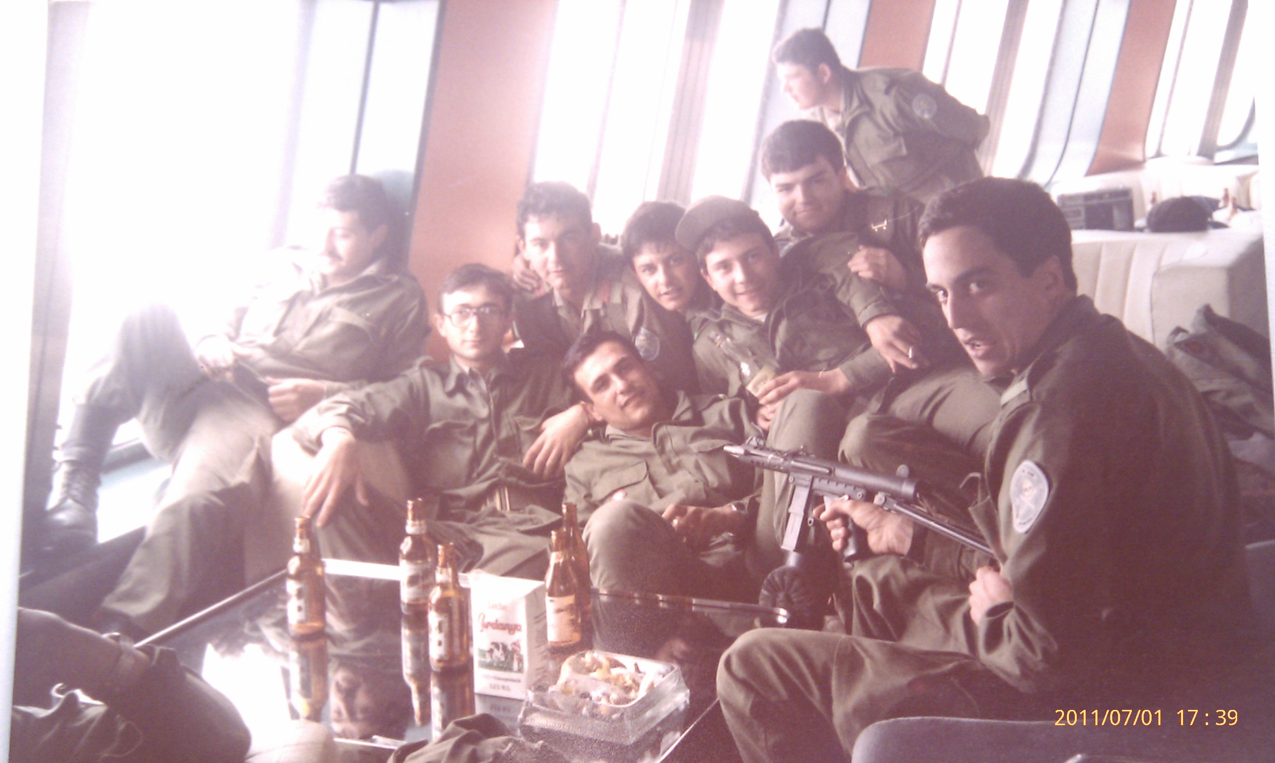 La sección de trnsmisiones de Plana Mayor en el barco que los llevó a las maniobras de Almería en 1.983. Todos buenos amigos míos, aunque un poco cerveceros, y "jugando con las armas (ejem, ejem...).