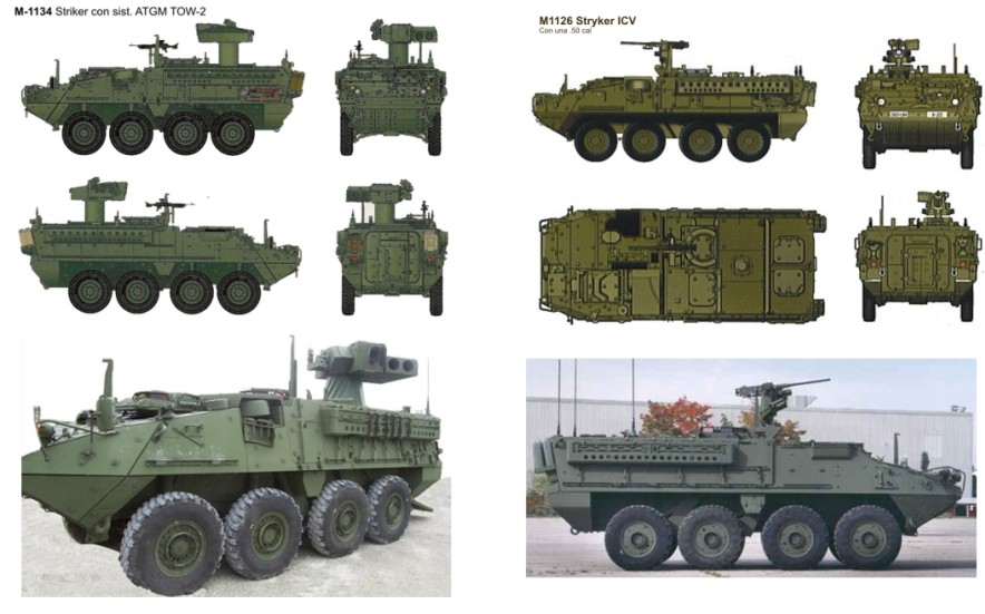Los batallones Stryker como todos sabéis están dotados con toda la gama de vehículos de la familia Stryker 8x8 que os detallo a continuación: