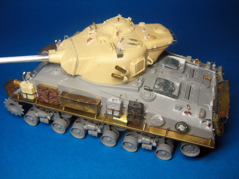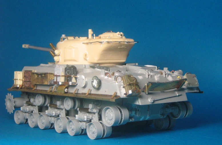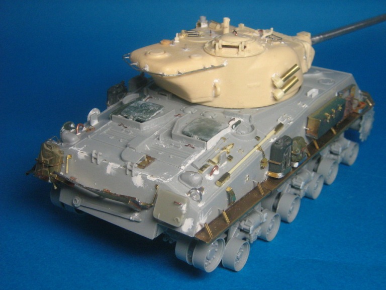 como veis un M50....todo lo que veis, en barcaza de color distinto al gris claro del plástico (excepto los protectores de los faros), son una transformación para convertir un sherman WWII en uno israelí...bueno, los guardabarros son propios también de los HVSS..