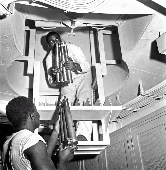 Gunners loading 40 mm cannon (background) and 105 mm howitzer (foreground)