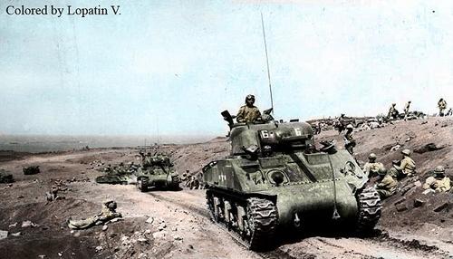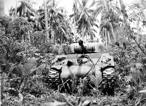 sobre los sherman del USMC, en la fase final de la campaña del pacifico (iwo jima, okinawa, por ej...), existe cierta controversia sobre de que version eran...hay fuentes que hablan de unicamente de A2 y otras comentan que tambien tenian A3...la cuestion es que con esos blindajes adicionales, los dispositivos de vadeo y los sacos terreros por doquier, todo ello unido a que las fotos en generla no permiten identificar correctamente a estos carros, pues eso..que no esta del todo claro...hay que tirar de expedientes...y en ellos si que se comenta la existencia de estas dos versiones...pero, lo dicho, viendo las fotos no se puede, en muchos casos, identificar correctamente estos sherman del USMC...